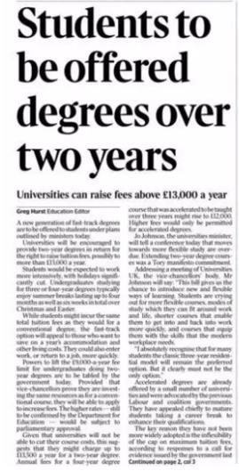 据《泰晤士报》报道,英国高等院校即将引入高学费的快速学位课程。两年制的课程成本将于三年制的相同,这也意味着每年度的学费将上涨,教育部部长们提出将取消目前每年9,000英镑的学费上限,大学学费即将上涨到13,000英镑/年。