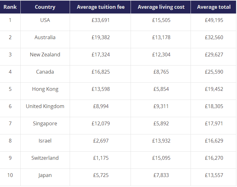 美国第一!第一!不管是学费还是生活费,都是妥妥的第一(拿到第一名不知道该不该礼貌性的鼓掌)!相对而言,英国和加拿大确实划算了不少。