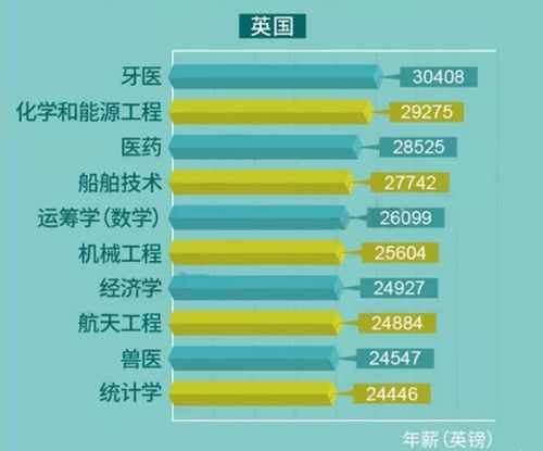 这是英国高校毕业生十大高薪专业排行榜。除了牙医、医药、兽医,其它都跟STEM沾边。其中,STEM的平均年薪将近26000英镑。