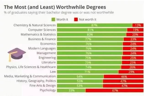 日前,薪资调查网站Emoulment公布了一个调查结果:由1800名应届毕业生评选出的,大学里最有用与最不值得读的专业。
