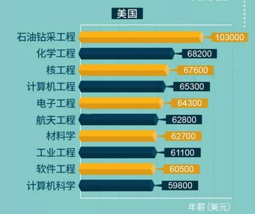 美国更夸张,十大高薪专业,全部都是STEM。STEM平均年薪,逾60000美金。