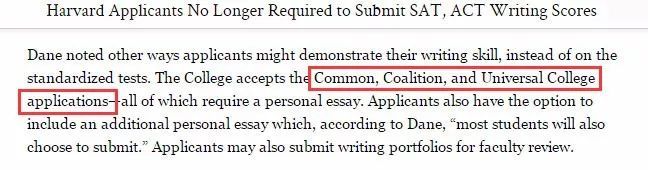 但学生通过Common Application、Universal College Application或者Coalition Application申请时仍然需要提交essay。此外,大部分申请者还是需要提交哈佛大学的补充文书。如果对写作天赋比较自信,哈佛大学鼓励申请者提交一份作品集。