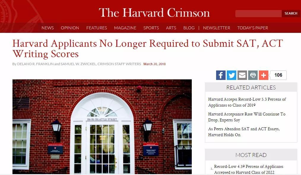 前几天藤校中的哈佛大学也宣布申请者不再需要提交SAT或ACT考试写作部分的成绩。从2023届(即2019年秋季入学)开始,哈佛大学申请者提交的ACT或SAT成绩,可包含或不包含写作成绩。