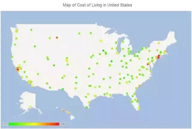 根据网站的调查结果,美国各地的消费指数在121-290之间,如图: