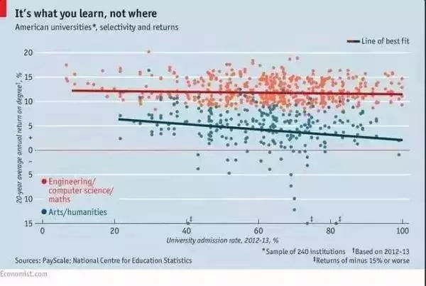 《The Economist》做过一个关于美国大学选择与回报的调查研究。大数据表明:从未来的收入水平看,“学什么专业”比“在哪里学”更重要。