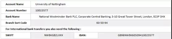汇款前,需要向学校核实账户信息,举例诺丁汉学校账户信息: