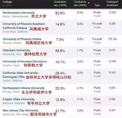 毕业率最低的10所公立大学,毕业率都在15%以下,南新奥尔良大学毕业率居然只有4%,其余的或者辍学,或者没能在6年之内完成大约120个学分的本科课程。