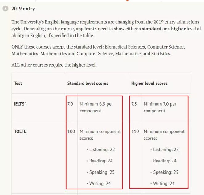而Higher level雅思总分7.5,比原来高出了0.5,单项小份还是7.0,说明其他专业的语言要求变严格了。