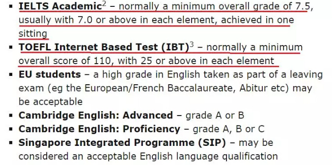 牛津和剑桥都接受雅思、托福,CAE、CPE,不过牛津接受的语言成绩更多样化,包括大家熟悉的GCSE English和O-Level English。