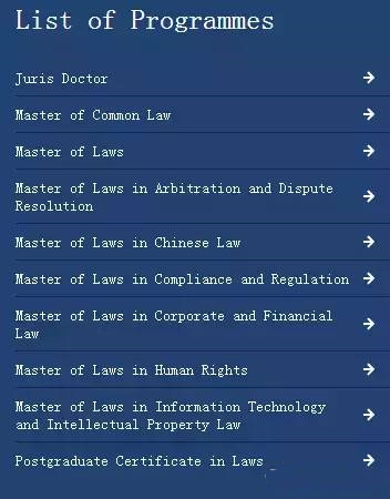 香港大学的法律学院1969年成立,目前分为两个部门,即Department of Law 和Department of Professional Legal Education,总共雇佣了世界各地超过80名的教师。2014年9月份统计数据显示,学院有847左右的本科生,410的修读法学专业证书的学 生,79名JD学生以及467名全日制或兼读制的研究生。目前开设的研究生课程有如下图: