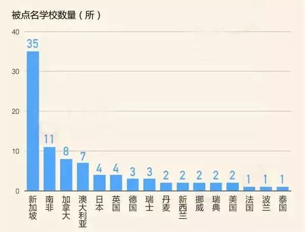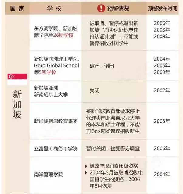根据教育部的留学预警中,新加坡被点名学校共35所,居榜首,其次是南非11所、加拿大8所,澳大利亚7所、日本4所、德国3所、瑞士3所、丹麦2所、新西兰2所、挪威2所、瑞典2所、美国2所、法国1所、波兰1所、泰国1所、英国4所: