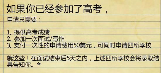 新增的4所接受国内高考成绩的大学,需要通过美国名校普遍认可的第三方面试机构初鉴InitialView的面试,并提交最新的高考成绩单,以及50美元的一次性初鉴面试及大学申请费用(常规的初鉴面试费用在220美元),即可同时提交申请给这4所大学。