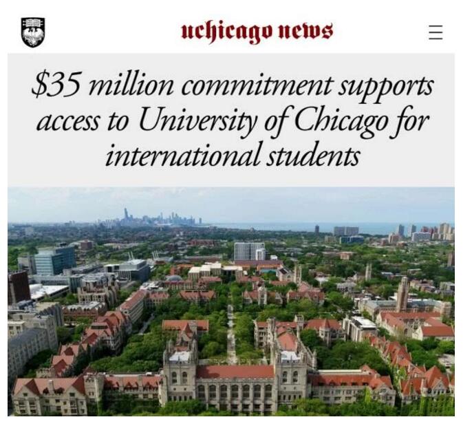 芝加哥大学于近日获一位匿名人士捐赠3,500万美元,这笔捐款将用于为报读芝大本科学院的国际学生提供经济资助,进一步贯彻芝大全方位教育的方针。