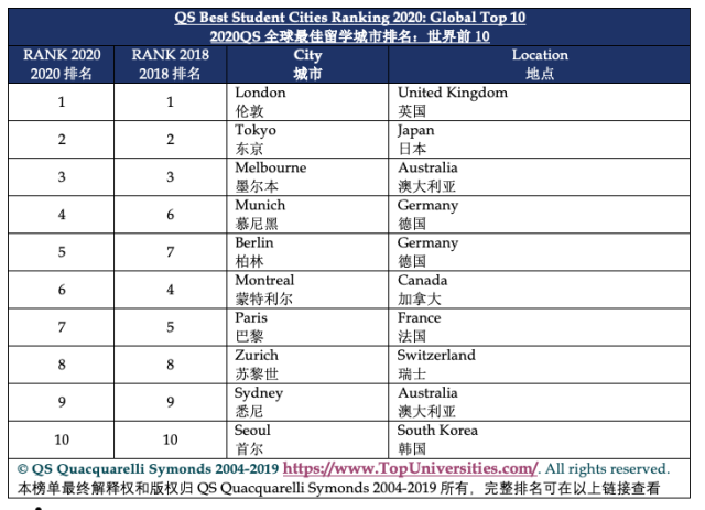 QS最佳留学城市排名包括全球120个城市,排名指标主要包括城市拥有大学的数量及其在世界大学中的排名情况,国际雇主在当地招聘的活跃程度,生活成本以及学生群体的多样性等。