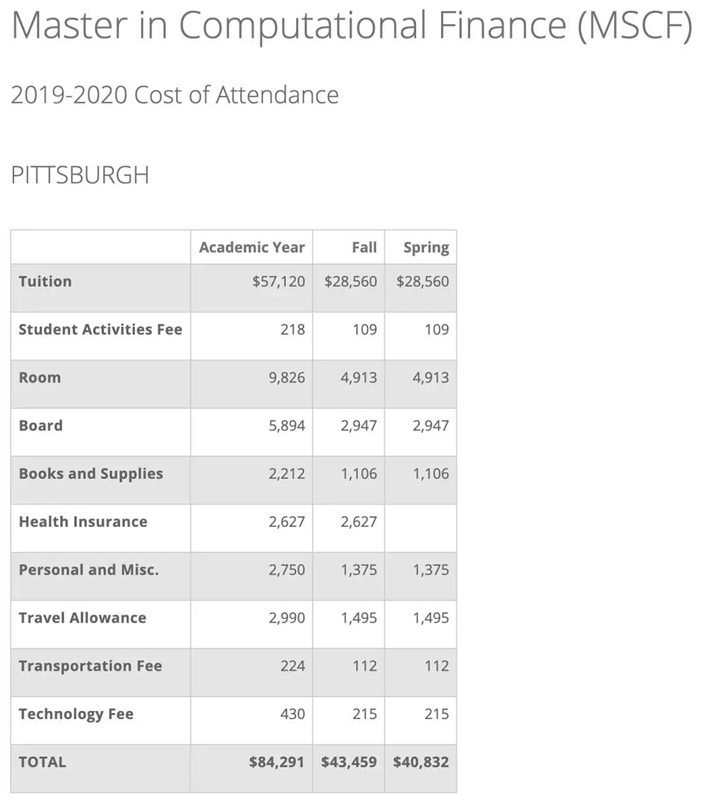 第一个方式是上学校的官网,了解一下大概的费用。比如,想知道卡耐基梅隆大学的计算金融硕士项目在匹茨堡地区的费用情况,则登录学校官网,可以看到具体费用列表: