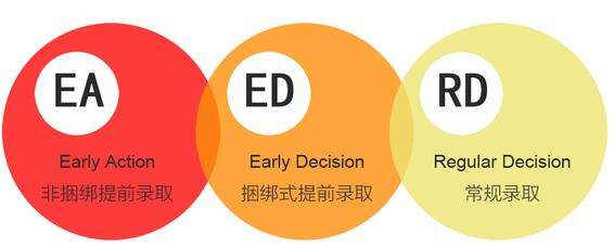 EA: 全称是 Early Action(提前申请),顾名思义,这个是相对于RD的申请,时间会比常规申请截止日期提前进行,绝大多数的学校EA的申请截止日期为每年11月1日,一般Notification的时间是12月中上旬。采用EA录取的大学一般可以申请多所学校,具体细节要看各个学校的要求。EA被录取的学校可以选择不去就读,属于非绑定性质的申请。EA被拒绝或推迟也同样不会影响学生的RD申请。EA申请的优势在于,对于成绩比较优秀的学生,可以在EA申请上选择一些相对适合自身条件的学校,排名可以略高一些,这样往往在12月的批放榜时,就可以拿到排名比较好的学校录取。因为是非绑定式的录取,所以可以在接下来的RD申请中,有这样一个或者几个EA排名比较好看的学校保底(美国开设EA的学校大部分都在综合排名50名之前),冲刺排名更靠前的学校就会更有信心,以便在接下来的申请过程中取得更好的录取结果。中国学生通常比较喜欢申请的这类EA学校有University of Virginia,Carnegie Mellon University,University of Michigan-Ann Arbor等。