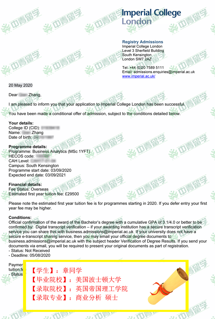 【录取院校】:英国帝国理工学院