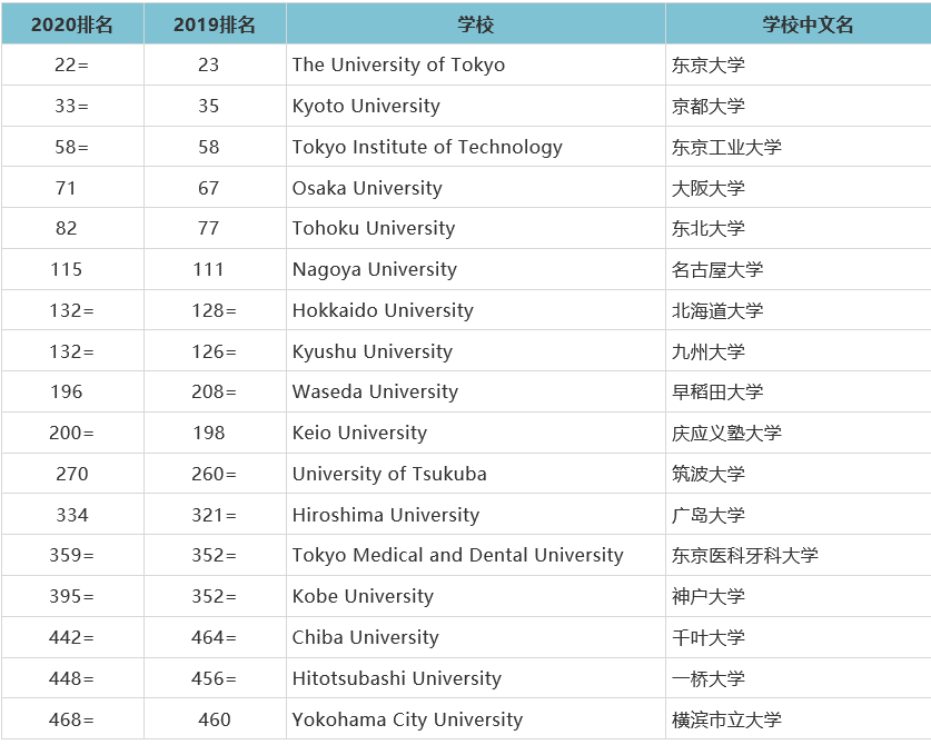 1东京大学,2京都大学,3东京工业大学,4大阪大学,5东北大学,6名古屋大学,7北海道大学,8九州大学,9早稻田大学,10庆应义塾大学,11筑波大学,12广岛大学,13东京药科齿科大学,14神户大学,15千叶大学,16一桥大学,17横滨市立大学