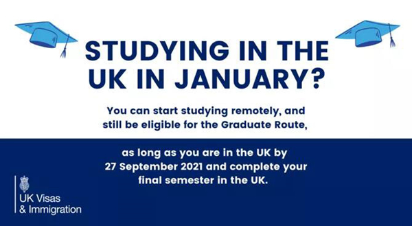 如果你是2021年1月刚刚入学或即将入学的一年制研究生,且面临着全球旅行限制,无法按时抵达英国学校报到,可以先进行远程学习,只要在2021年9月27日之前抵达英国且在英国完成最后一学期的学习,就仍然有资格申请毕业生工作签证。