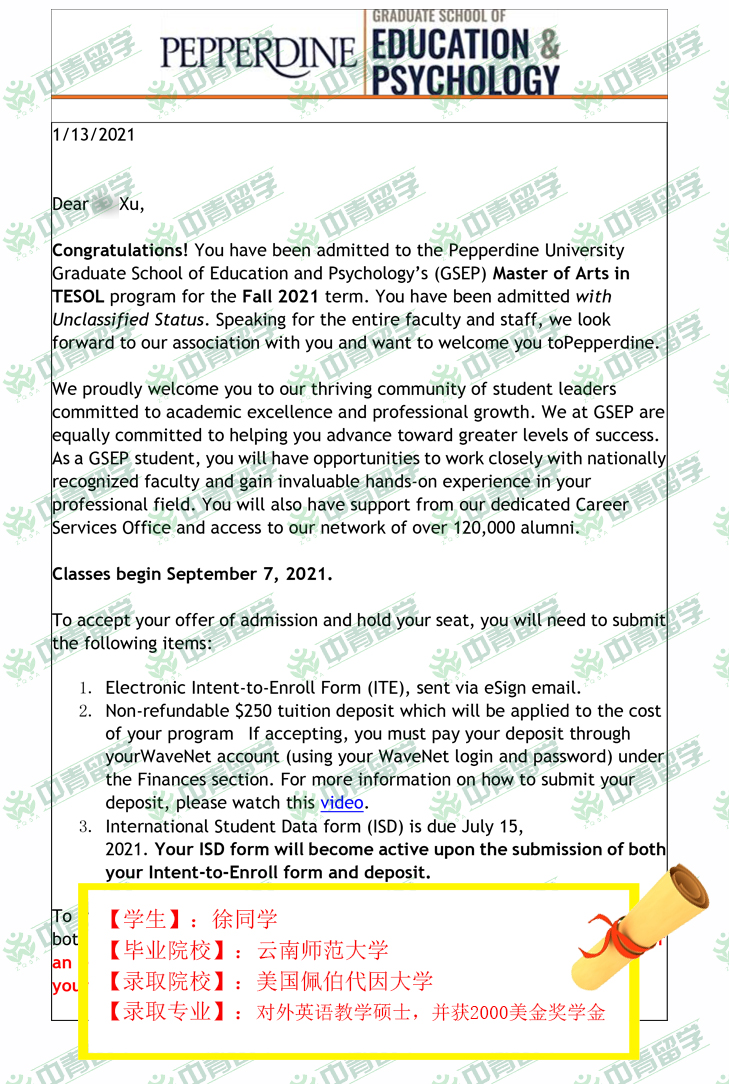 【专业】:对外英语教学 硕士,并获2000美金奖学金