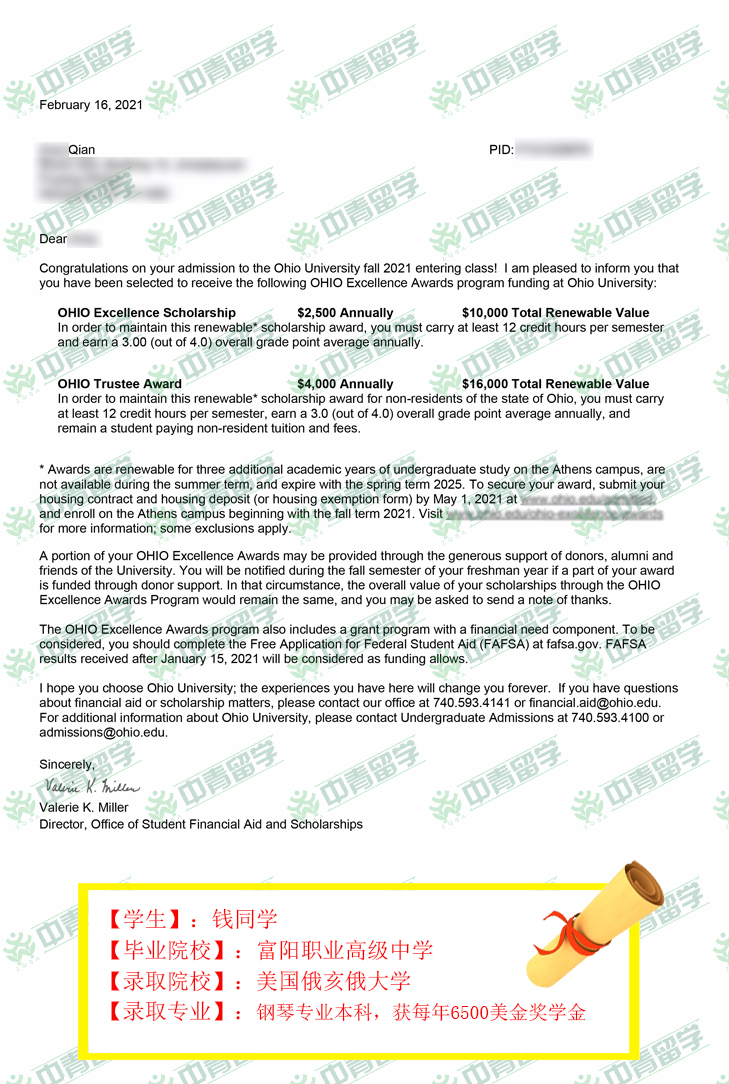 【专业】:钢琴专业本科,获得每年6500美金奖学金