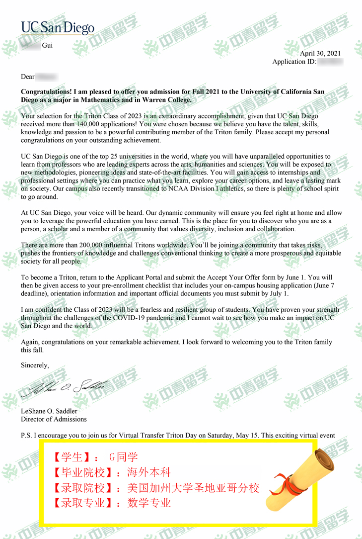 【录取院校】:美国加州大学圣地亚哥分校