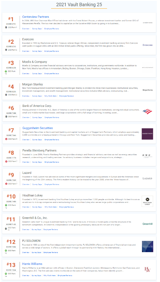 Vault自1996年以来一直为人们提供圈内深入的情报,受到《纽约时报、《华尔街日报》、《福布斯》、《财富》以及无数其他新闻媒体对其排名的引用。每年Vault都会对各大投行进行排名,意在找出最适合就业的投资银行。