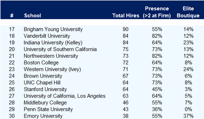 • Semi-Target School:这些投行中有不少校友的学校,但不一定在每家公司都有不错的表现。许多准目标学校只是在特定地区、行业或银行中占据主导地位,并不具备全国性优势。