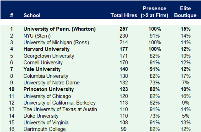 据报告结果,美国有16所投行目标学校。以下几所学校占据绝大多数资源: