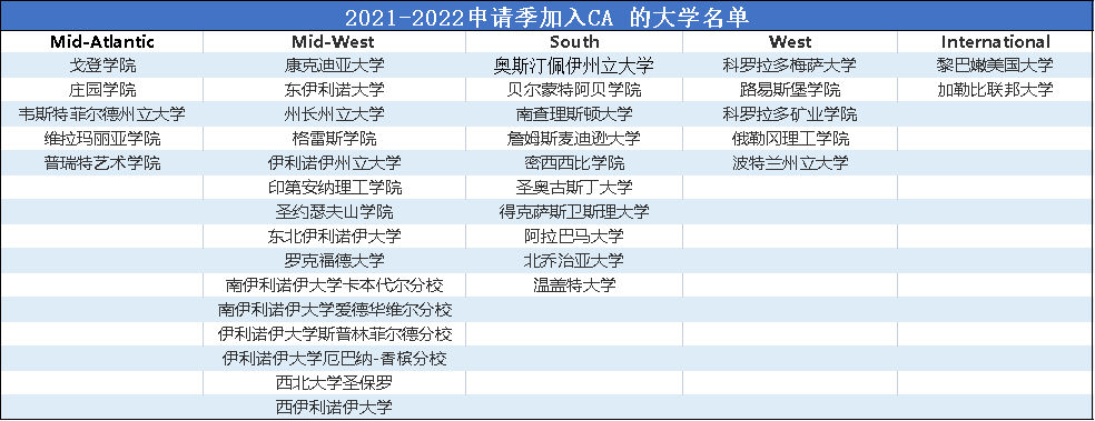 CA是美国大学的三大申请系统之一,此外还有加州系大学共用的 UC申请系统,以及美国80多所大学2015年联合推出的新网申请系统(Coalition for Access, Affordability and Success, 称为CAAS)