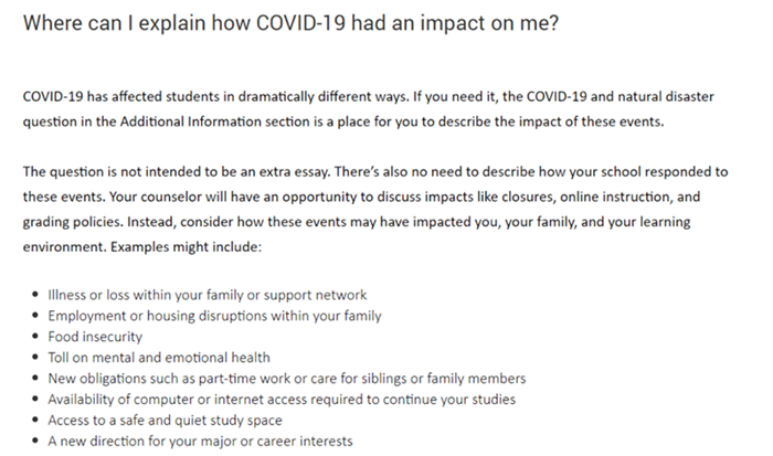 另外,Common App 将为申请者保留一个分享冠状病毒大流行对你个人和学术影响的机会,这是一个“可选”的问题,位于申请表的附加信息部分。