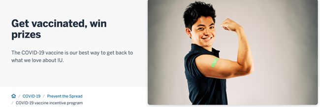 印第安纳大学强制要求学生接种疫苗,并从6月7日至7月1日,每周抽取30人,学生奖品包括2021-22学年的校内停车证、价值500美元的书店礼品卡,教职工的奖品有AirPods Pro、Apple Watch、Yeti冷却器等。