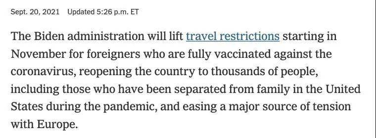 美国时间9月20日,白宫宣布,美国将从11月初开始取消对外国公民的旅行禁令,重新开放边境,已完整接种新冠疫苗的外国人可入境美国。