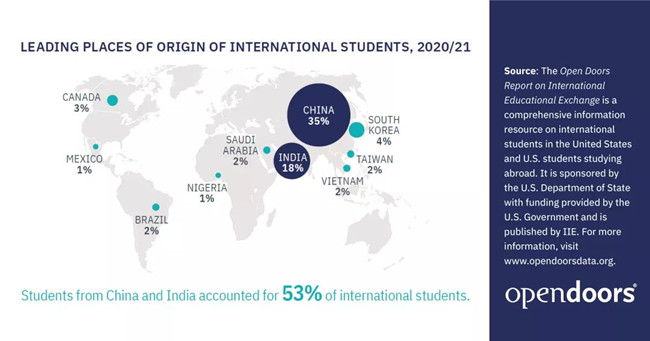 美国当地时间11月15日,美国国际教育学会(IIE)发布2021年最新《美国门户开放报告》(Open Doors 2021 report),对全美教育门户数据进行了全面统计。