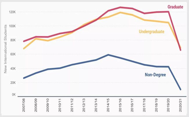 此外,数据还在显示,在新注册的国际学生当中,本科、研究生、非学历项目人数均下滑明显。2020/21年度,本科新注册国际学生人数69183人,同比去年减少34.1%;研究生项目新注册66082人,减少45.1%;非学历项目减少75.8%。