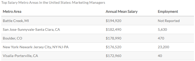 咱们以平均薪资水平最高的市场经理为例,就业薪资高的城市包括:圣克拉拉、博尔德、纽约等,高达17万美金以上。