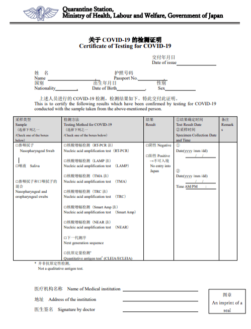 1.「検査証明書」:出发前72小时以内的核酸阴性证明书