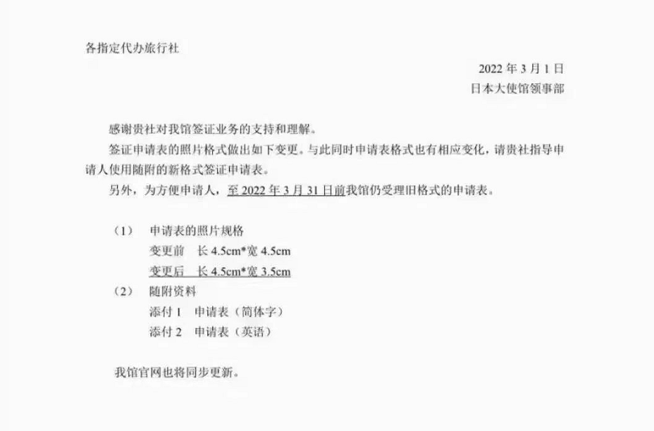 另外,在签证办理方面,近期日本大使馆发出通知,表示从4月1日开始,将更改申请表上的照片尺寸,将由原本的尺寸竖4.5cm*横4.5cm变更为竖4.5cm*横3.5cm。