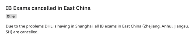 今天,IB宣布因DHL物流无法送达的原因,故取消中国华东地区的IB考试,包括浙江、安徽、江苏和上海四省市。