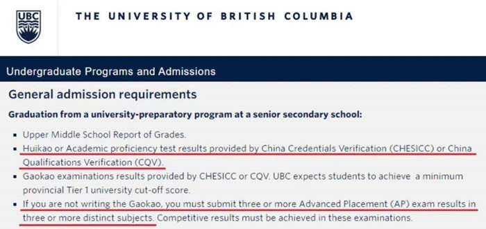 不列颠哥伦比亚大学(UBC)要求普高申请者必须提供会考成绩或高考成绩,且需要完成学信网认证。与多大要求相同,UBC也是要求高考成绩必须达到一本线以上。