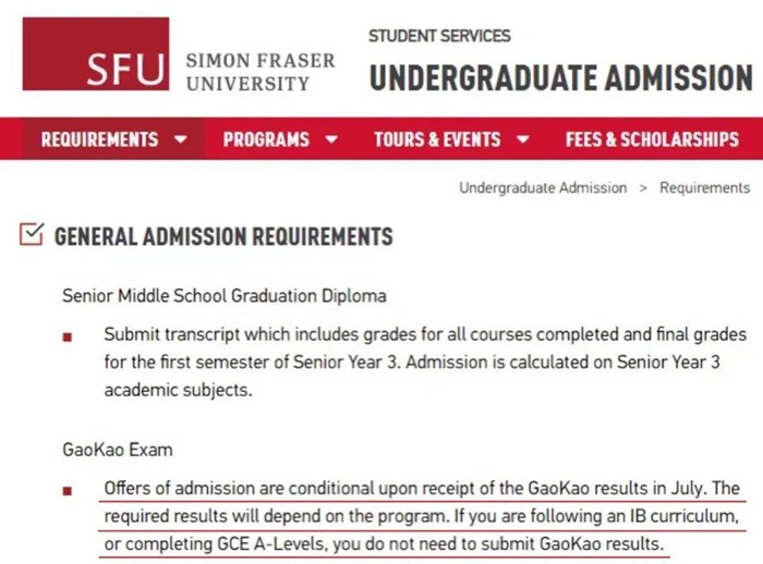 西蒙菲莎大学是要求普高申请者提供高考成绩的。但是,对于没有参加高考的申请者,也可以提供IB和A-Levels成绩。