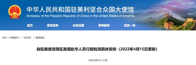 近日,中国驻美大使馆发布回国新政,宣布自2022年4月22日起,自美国出发赴华人员登机前检测再次做出一系列调整。
