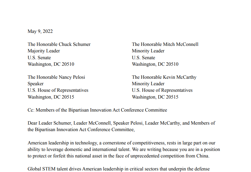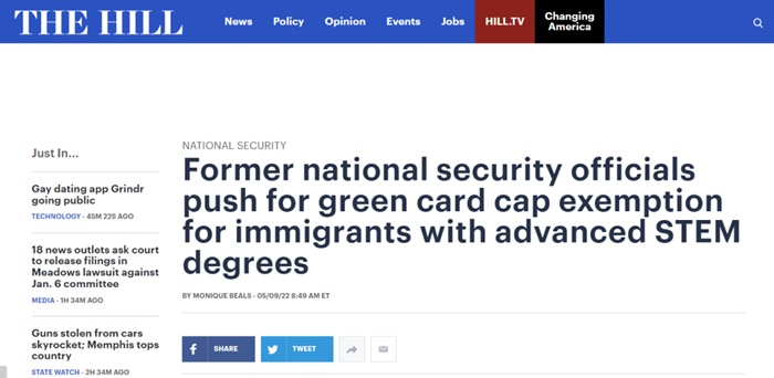 5月9日,美国《国会山报》消息,数十名前参议员、来自国防、能源和国土安全部的官员,以及中央情报局(CIA)、国家安全局(National Security Agency)和国防高级研究计划署(Defense Advanced Research Projects Agency)等机构的前领导人共同致信国会,“在当今的技术竞争中,美国强大持久的非对称优势是它吸引和留住世界上最优秀、最聪明的人才的能力,美国移民体系的瓶颈可能会浪费这种优势。”